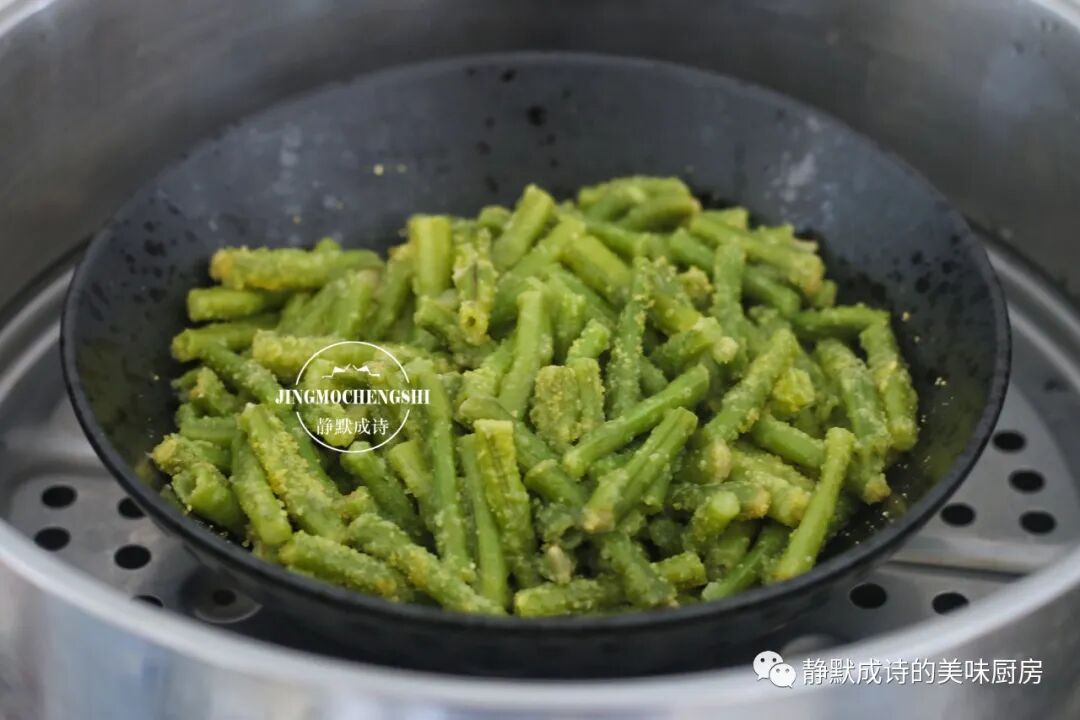 5、上锅隔水蒸上十几分钟即可关火,关火后要马上取出,不要焖,不然豆角颜色会变黄。