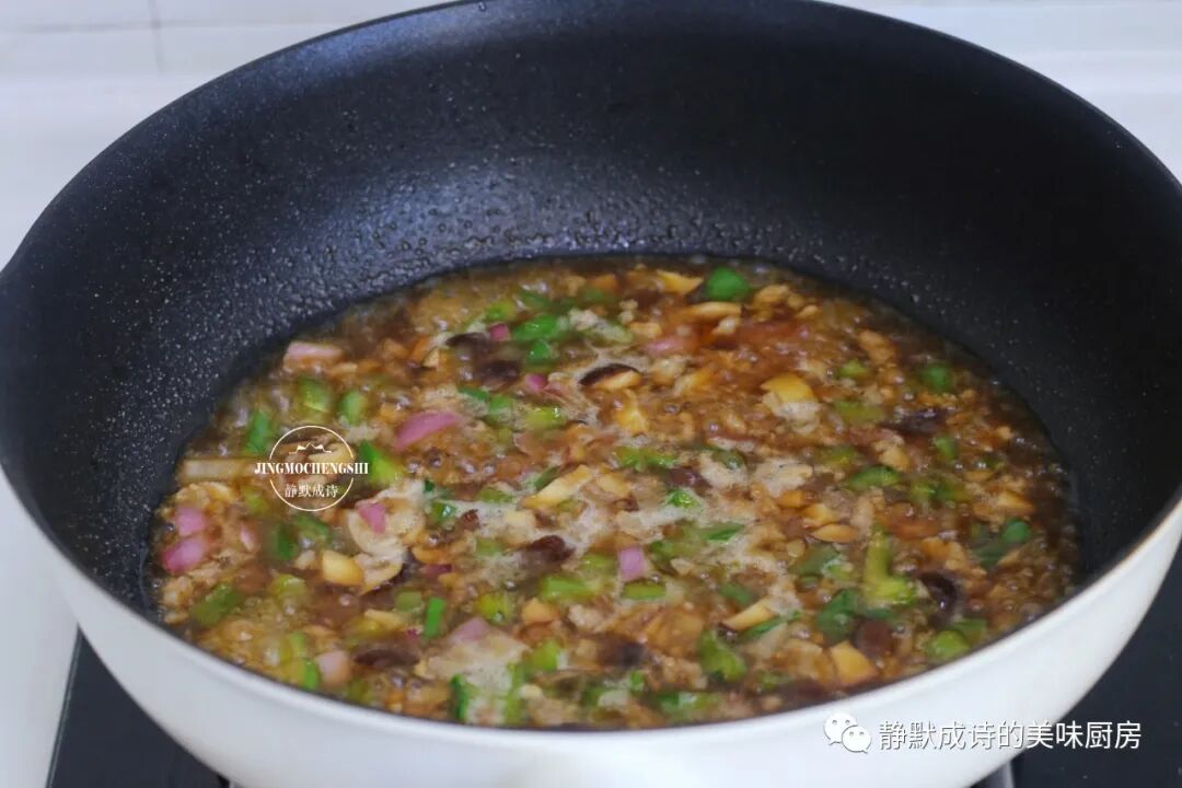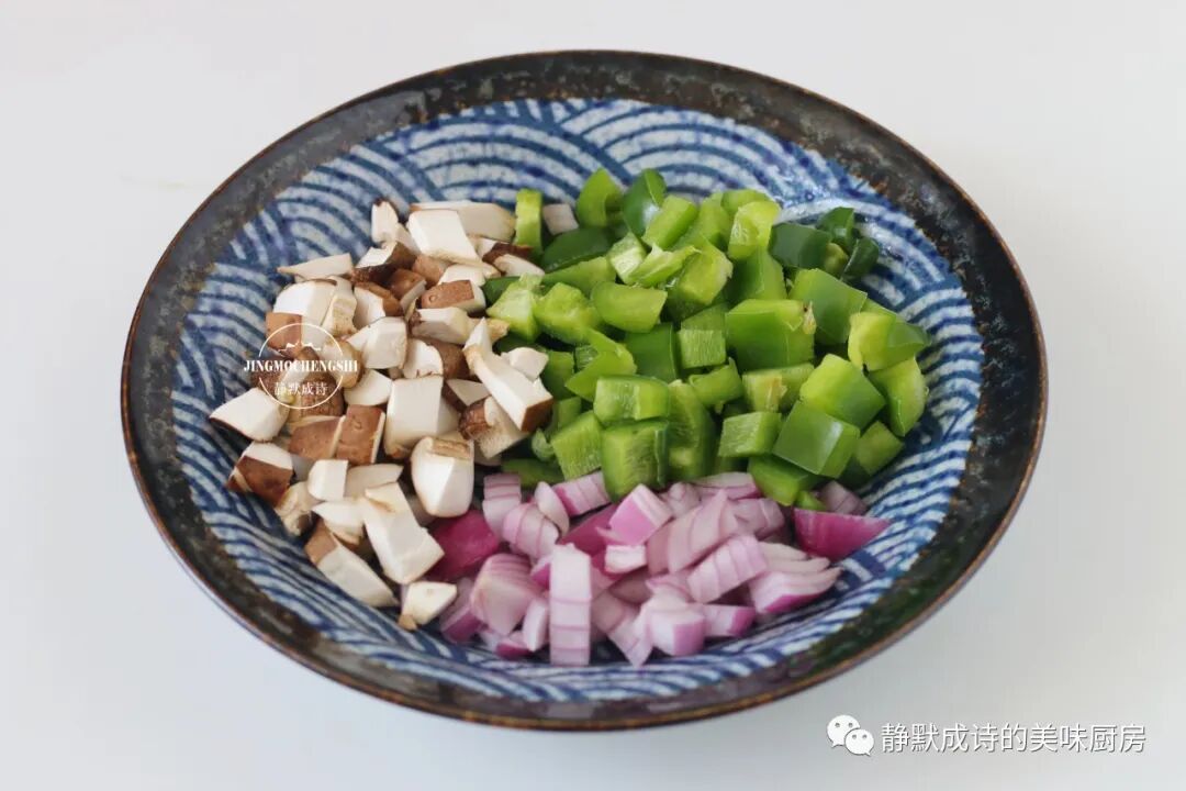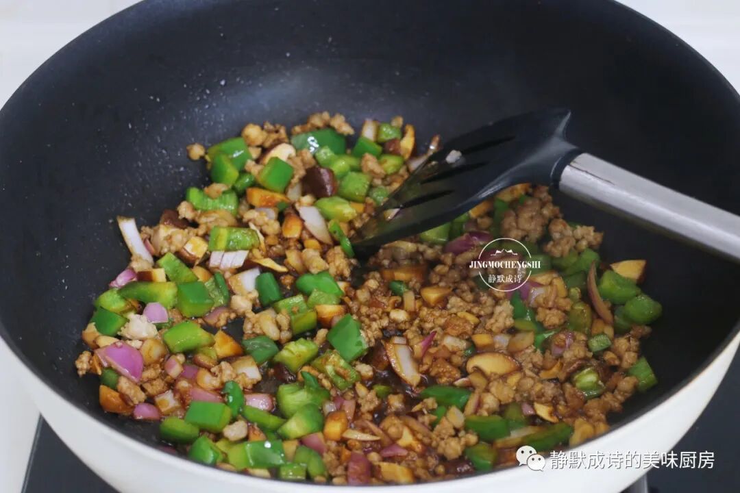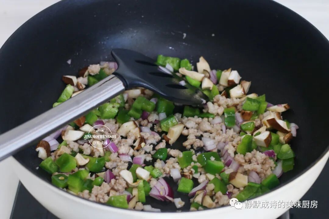 5、然后依次加入洋葱丁、香菇丁和尖椒丁,不停地翻炒出洋葱的香气。