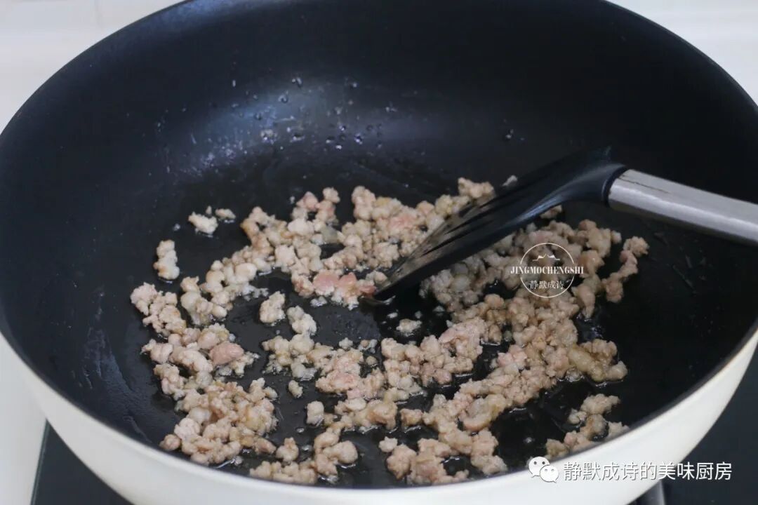 4、热锅热油,小火把肉末炒至变色。