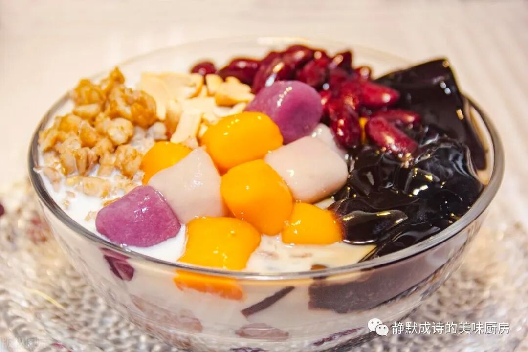 做法:50克仙草粉中加入200克清水,搅拌均匀待用;煮锅中加入1000毫升清水,烧开后,边淋入仙草液边搅拌防止糊底,开锅之后转小火,再煮约两分钟关火,过滤一下倒入模具中,放冰箱冷藏定型,然后再切成小块儿,搭配蜜豆、芋头小圆子、葡萄干、糖水等一起食用,好吃又消暑。
