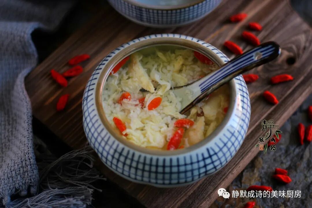 做法:把枸杞洗净,放进汤锅,加入适量清水,煮开后淋入蛋液,形成蛋花之后把酒酿倒进去略煮,关火,酒酿鸡蛋就好了,很简单的一道元气汤。如果喜欢吃糯米小圆子,可以放几颗进去,煮熟之后再淋蛋液加酒酿。