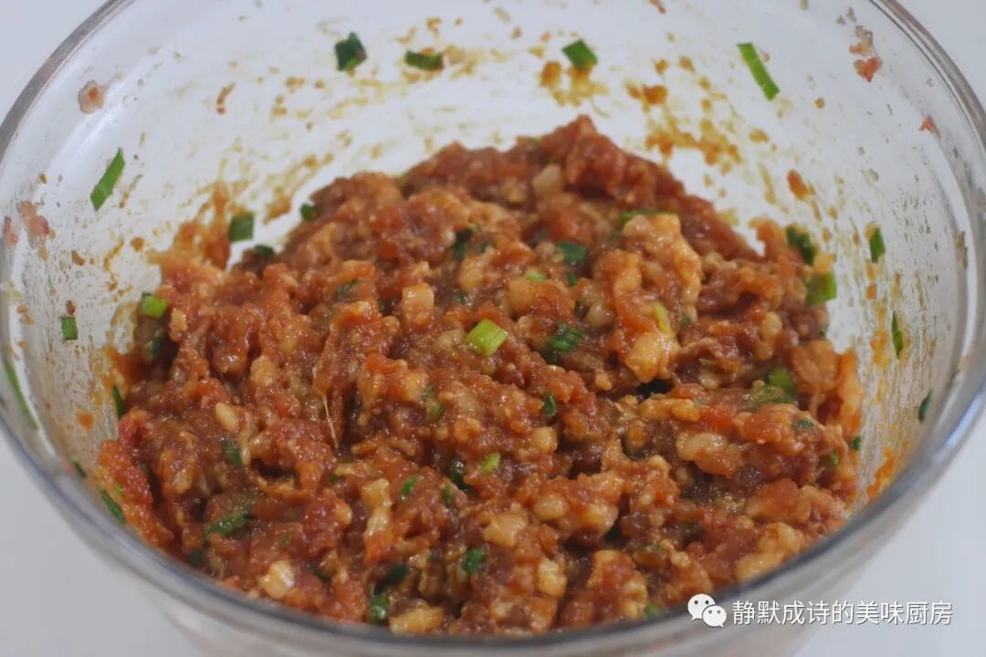 5、接下来调馅儿:花椒加水煮10分钟,晾凉后取花椒水待用,把猪肉馅儿放进大碗中,然后把花椒水分几次加入,加入后用筷子顺一个方向搅拌,让肉馅儿把花椒水吸收后再继续加入花椒水,直到肉馅儿不再吸水,然后加入生抽、盐、熟花生油、香油,搅拌均匀,最后加入姜末和葱花搅拌均匀,这饺子馅儿就成了。