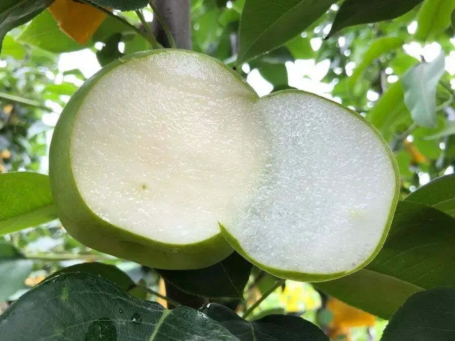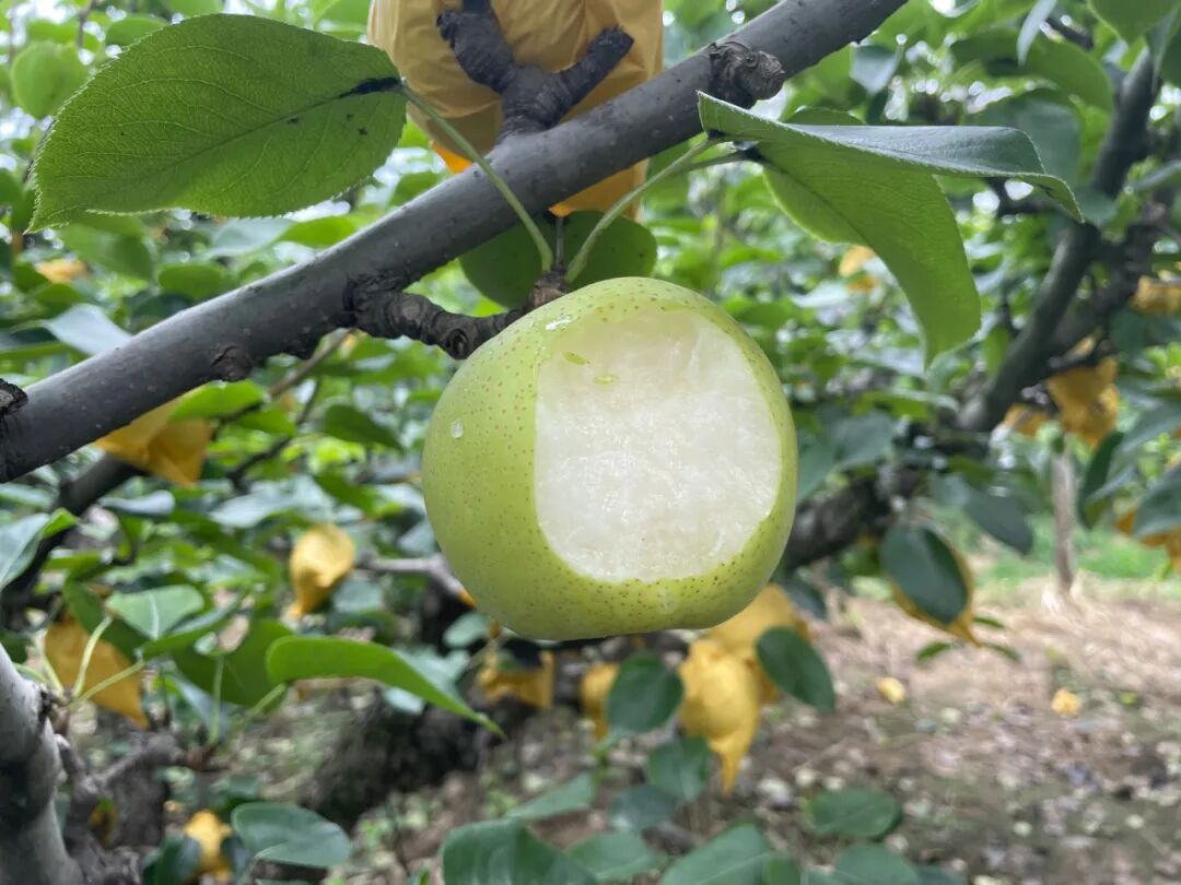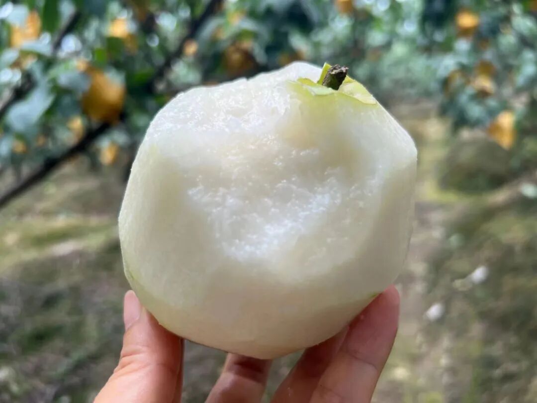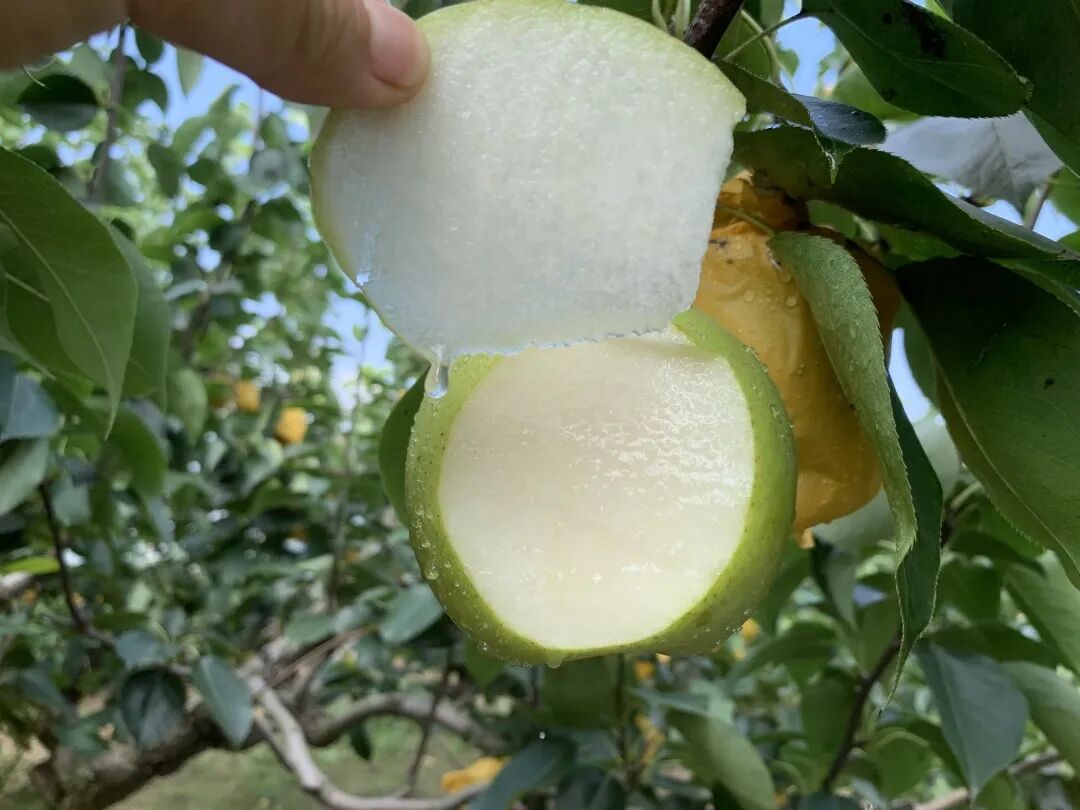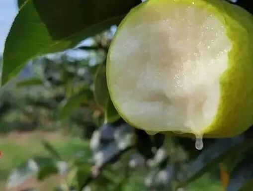 大多数的梨子咬下去都是沙沙的,而大河沙蜜梨咬下去松脆不带渣,水分很多,就像是在喝梨汁。