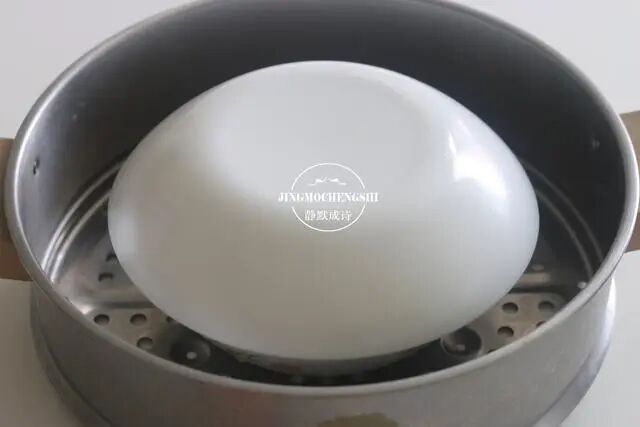 4、给大碗扣上一个大点儿的盘子,防止水蒸汽滴落,放进蒸锅,开火,蒸20分钟左右。