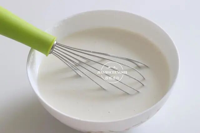 3、用手动打蛋器把糯米粉与牛奶搅拌均匀无颗粒。