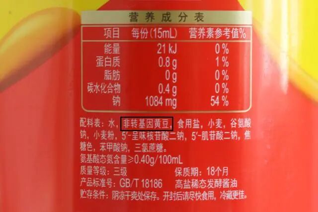 因为目前市场上有转基因黄豆和非转基因黄豆,酱油的原料主要是黄豆,所以,挑选酱油时,先看瓶身的配料表中是转基因黄豆还是非转黄豆。从食用价值上来说,非转黄豆中含有更多的不饱和脂肪酸,它对人体的益处很多。所以,拿起酱油瓶,第一眼,先看黄豆。