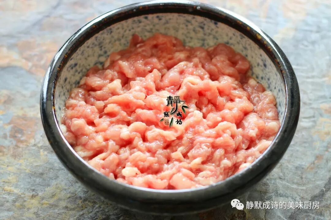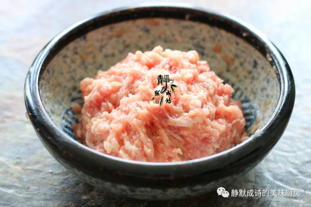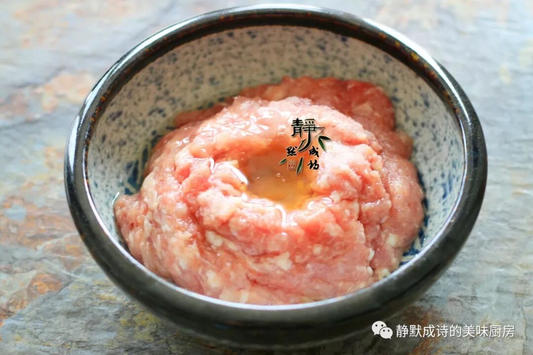2、用筷子不停搅拌,让肉馅儿与蛋清混合均匀。这个时候可以看出来,肉馅儿变得非常润泽。