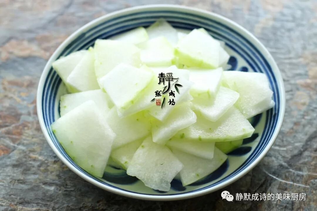 5、冬瓜去皮去籽后洗净,切成大薄片,冬瓜片不要太厚哦!