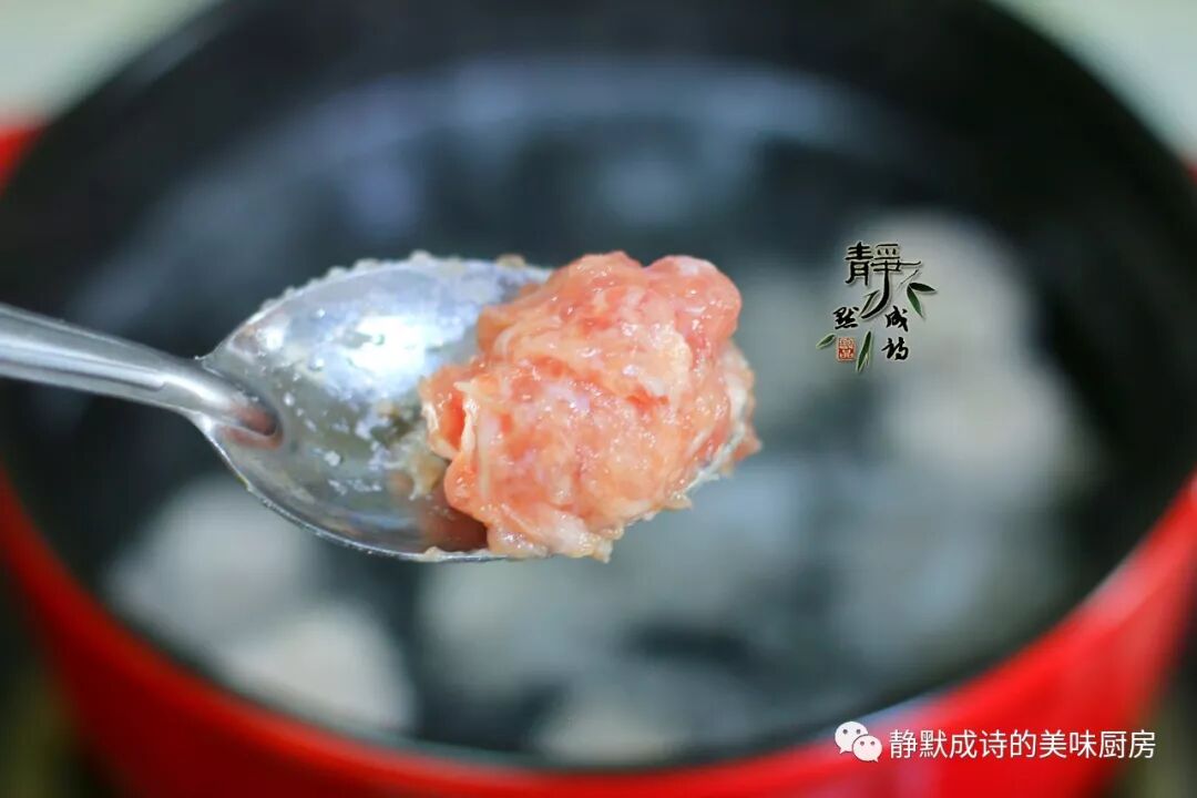 6、汤煲中添加清水,开小火,水开始变热一些时,用一把小饭勺舀起肉馅儿,在碗边整理几下团成圆形,下锅。这个过程无需下手。