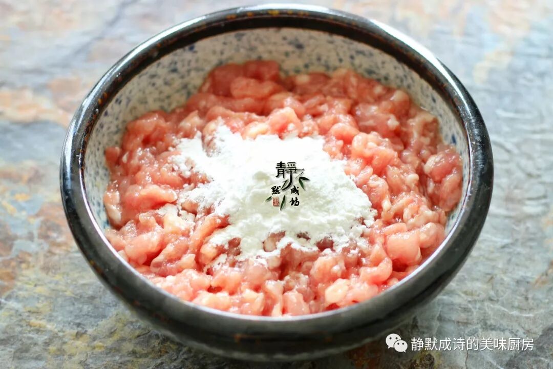 3、接着调入适量生粉,我加了不到3汤匙,加入生粉是为了让肉馅儿增加粘性容易抱团。