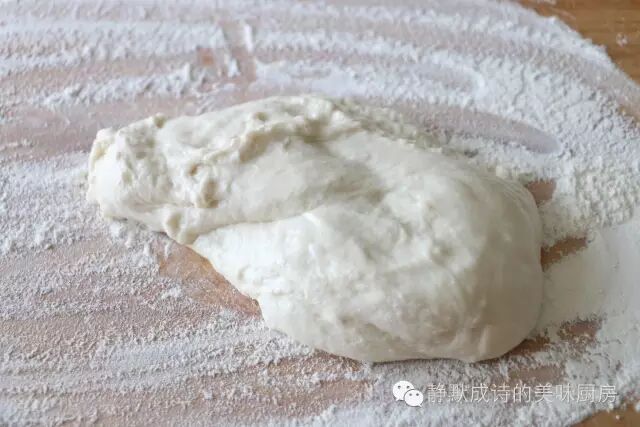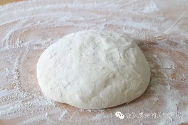 2、来个特写,这是我和好的面团,特别特别的软。我估计着面粉与水的比例大概在一斤面粉七两半至八两水之间。和好面以后,盖上湿布或保鲜膜,静置,让面团饧(xing)上半小时左右,当然时间越长越好。也可以前一天晚上和好面,放冰箱里,第二天早上拿出来用,会特别地好用。饧面的作用在于使得面团更易加工(擀时不回缩)、更柔软,做出的饼更加筋道、柔软,口感也更加细腻和顺滑。另外,夏季空气湿度特别大的情况下,面团饧发时就没必要覆盖湿布或保鲜膜了。