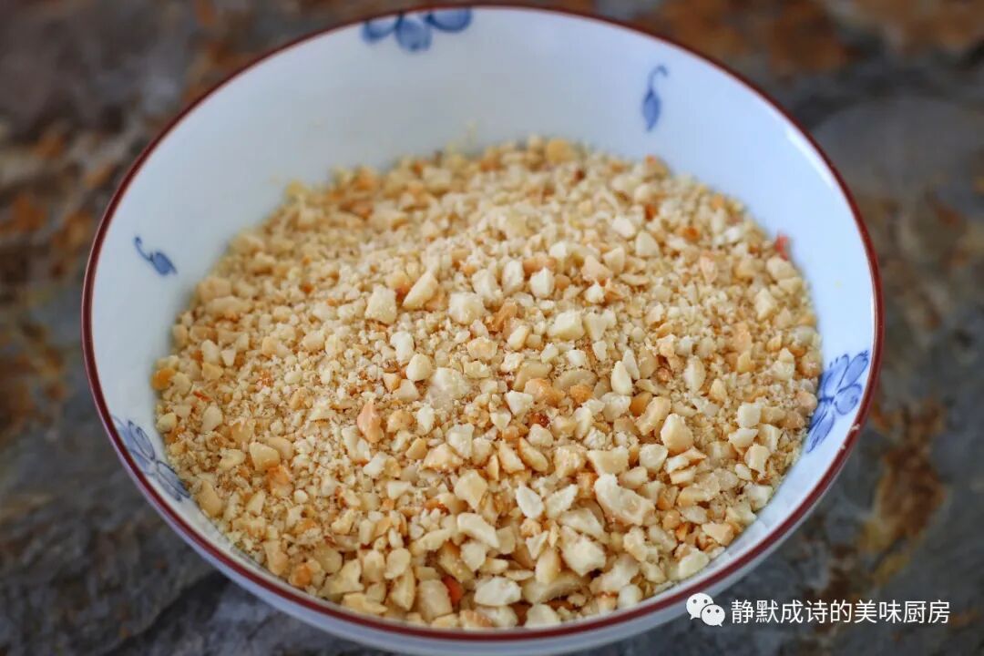 5、待花生米冷却,抓起一把花生,双手搓掉红衣。把光溜溜的花生米用擀面杖敲碎,我直接放进绞肉机绞成了小颗粒状。