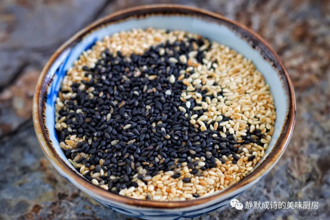 2、准备一些炒熟的芝麻,我直接买的熟芝麻,黑芝麻和白芝麻都来点儿,量自己掌握就好。