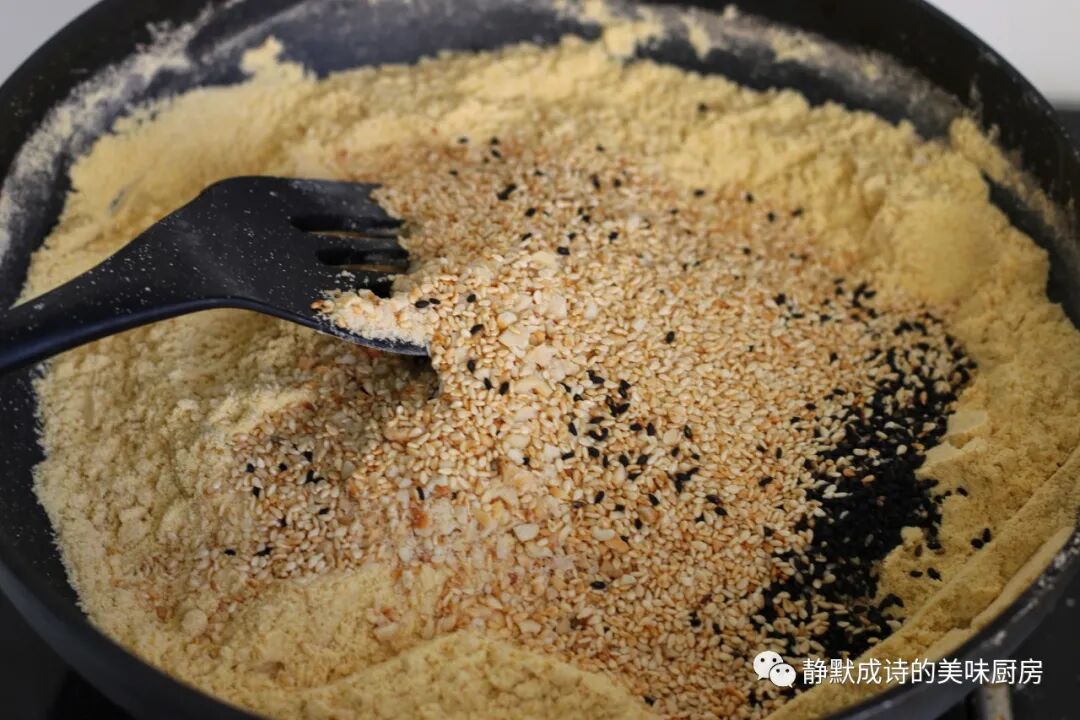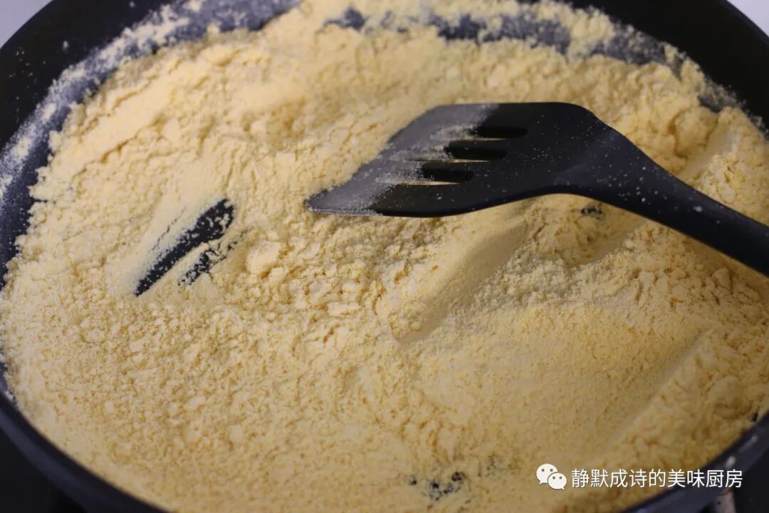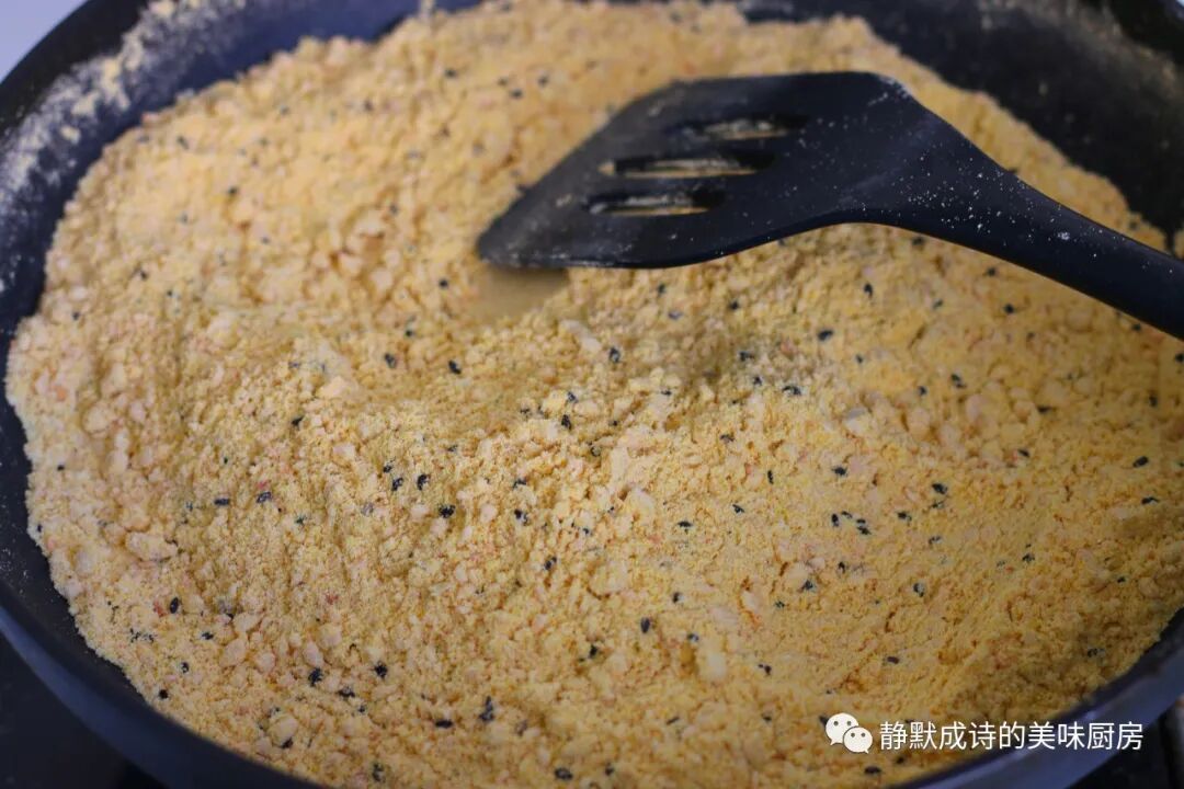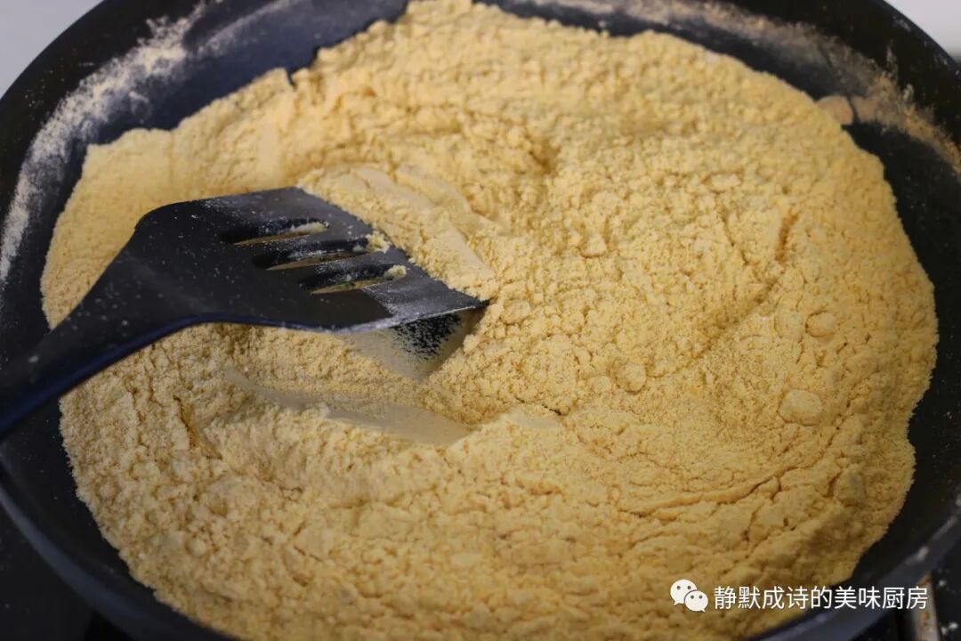 7、直到玉米面炒至变色,有玉米的香气飘出时,就需要进行下一步操作了。