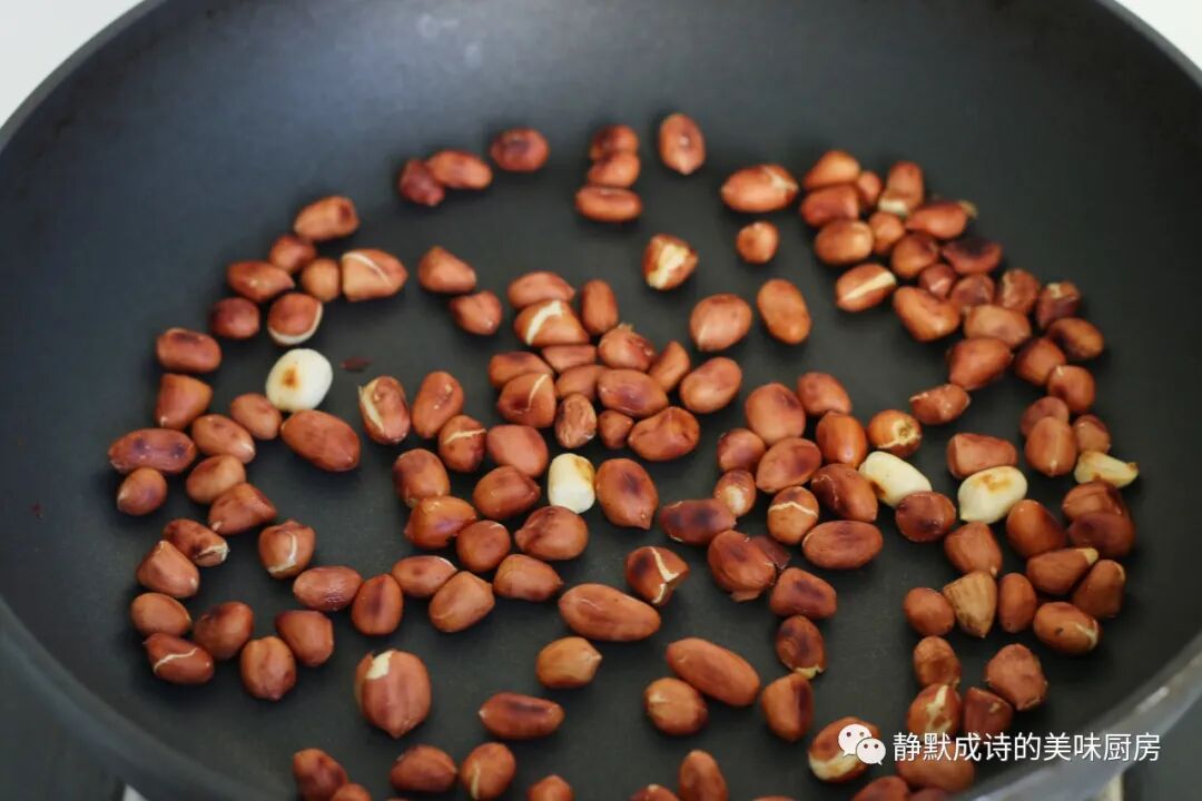4、把生花生米倒入炒锅,小火炒至花生仁变成微黄色,关火。炒花生米时无需放油哦!