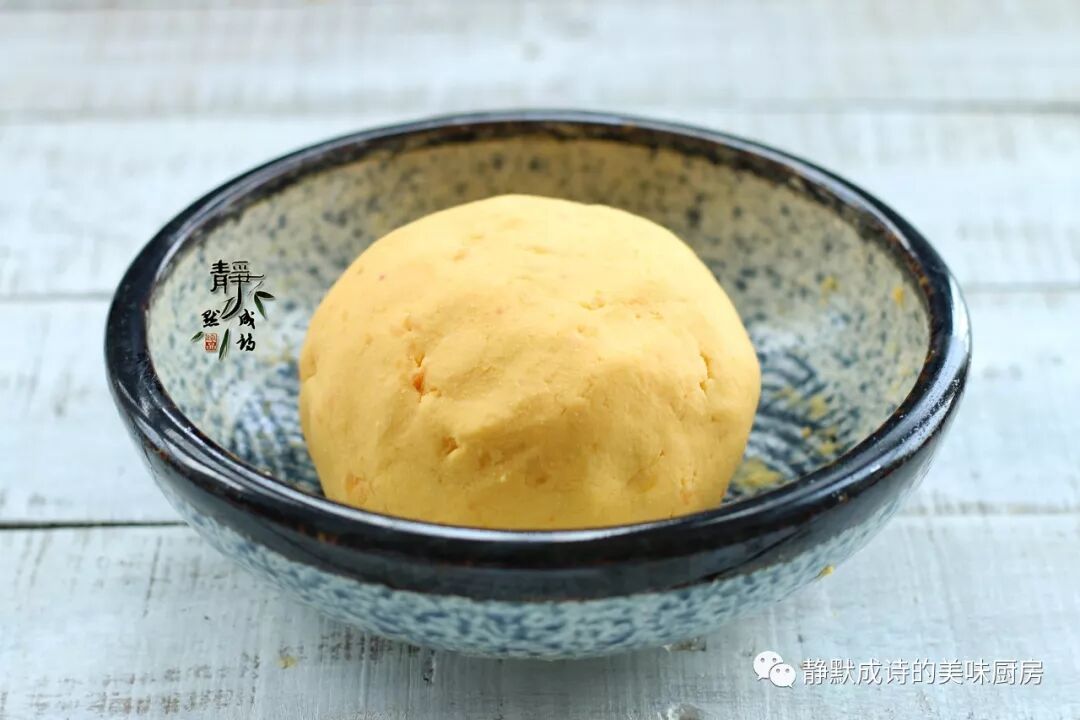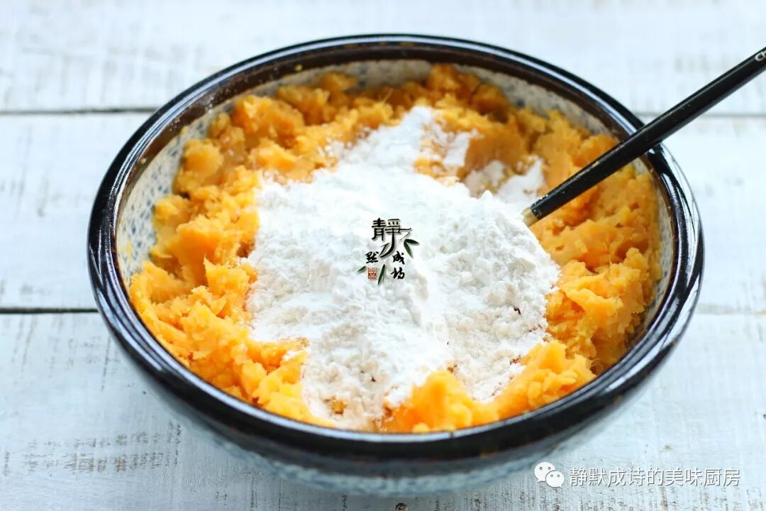 4、下手,把红薯泥与糯米粉和成软硬适中的面团,不必特别细腻,能成团即可。