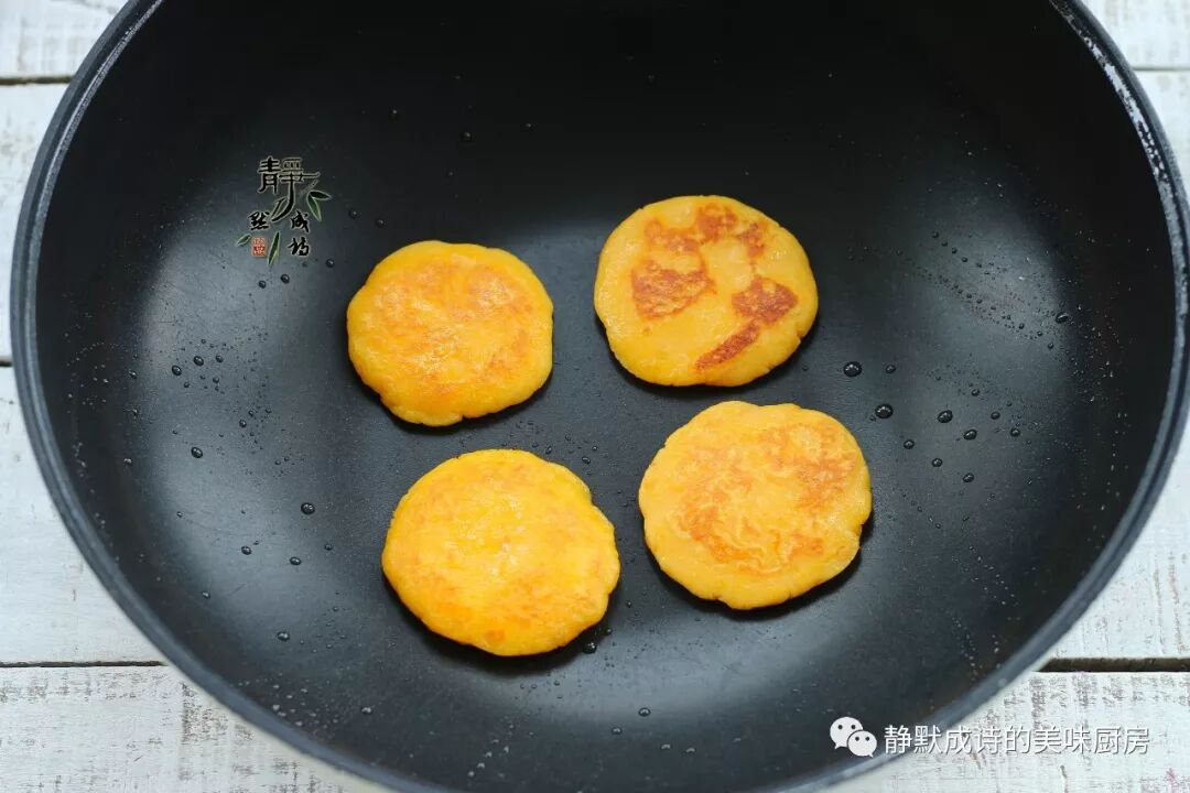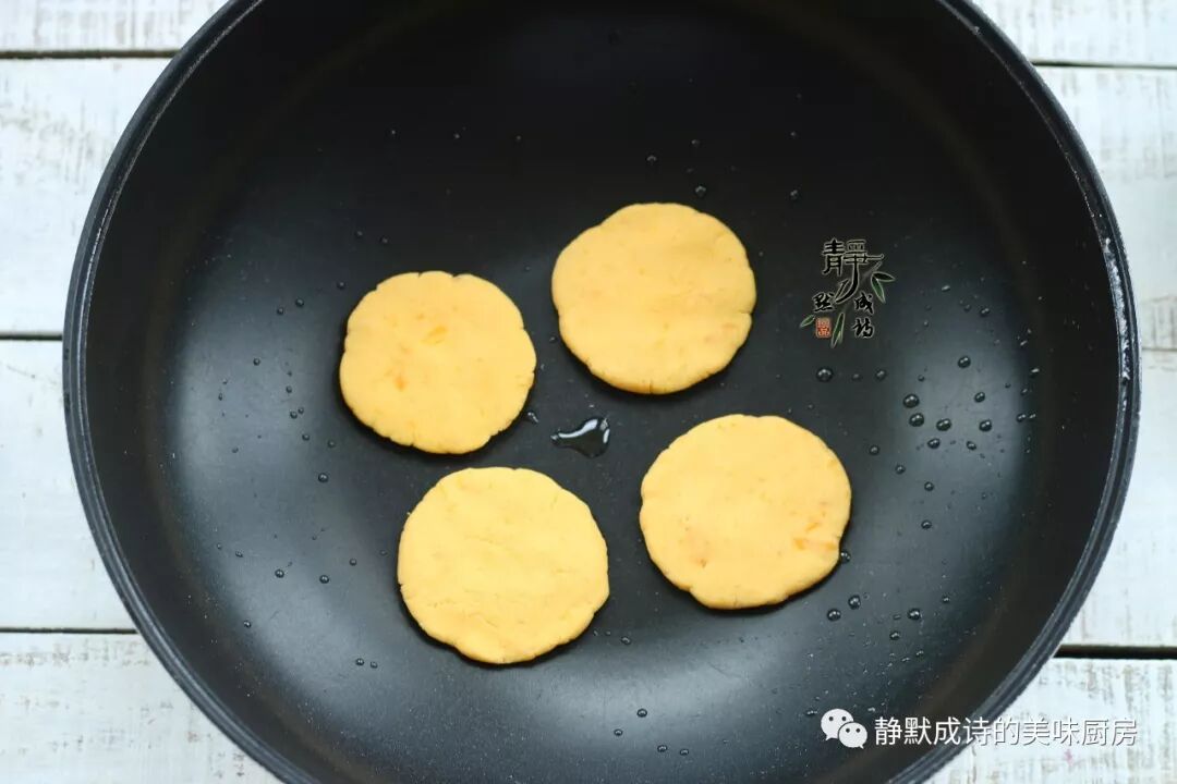7、煎好一面再翻面煎,两分钟就能煎好,如此依次把所有的红薯饼做好。