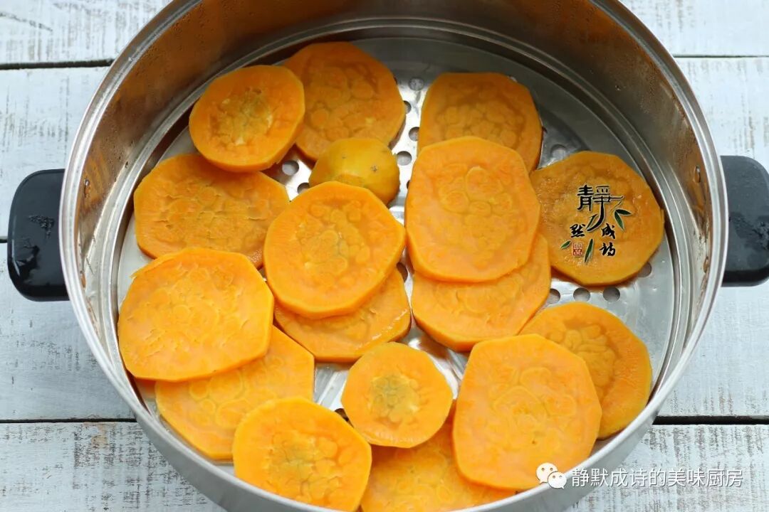 1、把红薯洗净后去皮,切成大薄片上蒸锅蒸熟,不要整个去蒸,浪费时间与能源。