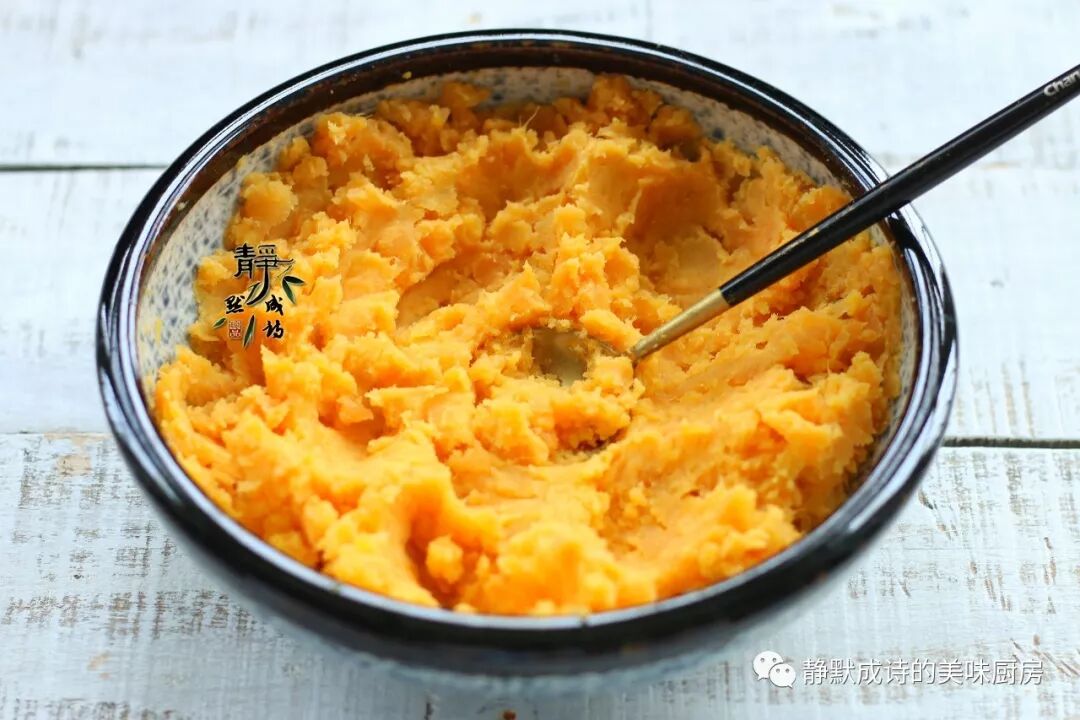 2、趁热把红薯片用勺子压成泥。这里可以尝一两口,如果红薯不是特别甜,可以放些白糖进去。