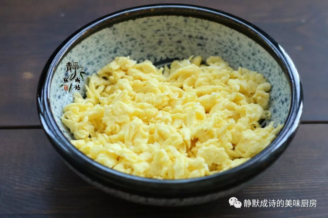 3、鸡蛋打散,加少许盐,调匀,油锅烧热,倒入蛋液,即刻用筷子划炒,蛋液开始凝固时要马上关火,继续用筷子划炒至全部凝固成小块儿,这样炒出来的鸡蛋都是小小的碎块儿,而且极嫩。把炒好的鸡蛋盛出来放进大碗中晾凉。