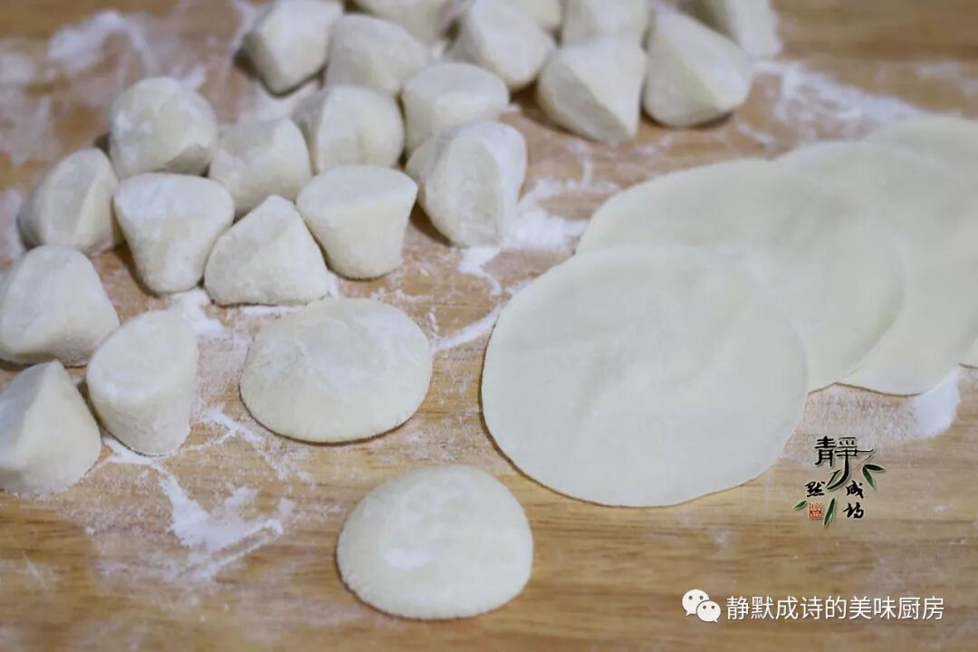 6、然后撒上些干面粉防止粘连,把小剂子按扁,擀成中间略厚边缘略薄的饺子皮。