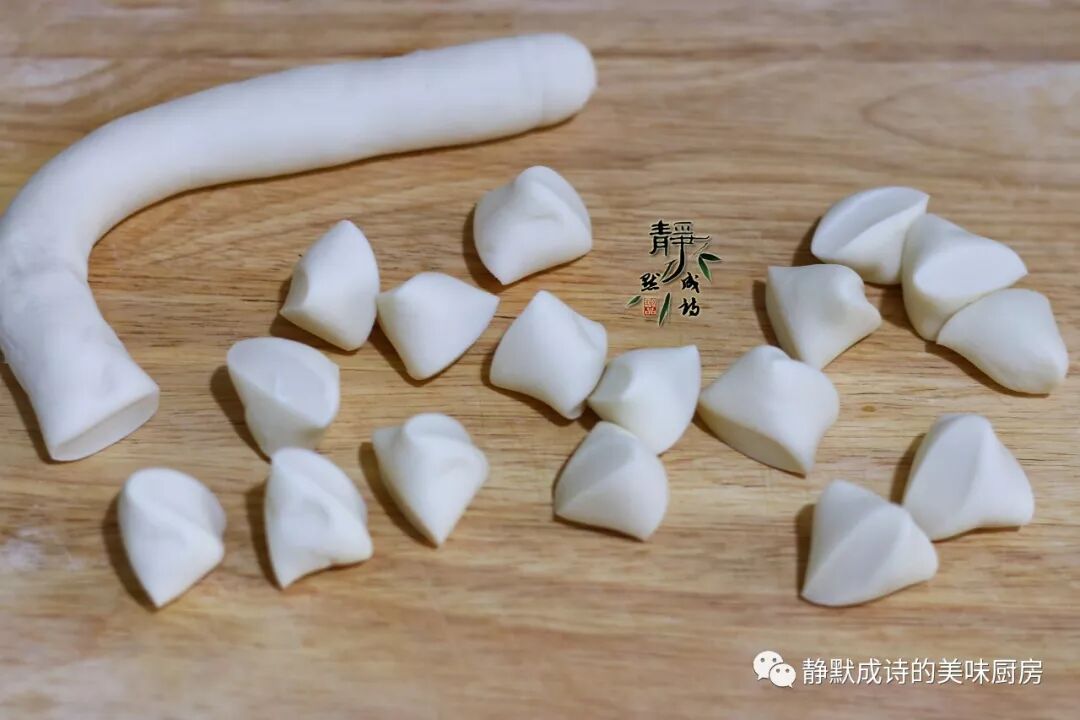 5、接下来我们先不调馅儿,先来整理面团。把饧好的面团取出,揉成长圆柱状,切成小剂子。