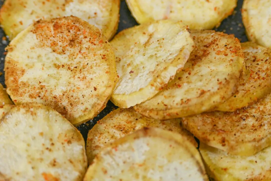 或者也可以把红薯切片直接放进烤箱烤,撒上一些调料,又香又脆, 浓浓的红薯香和板栗的粉糯相结合,一盘根本吃不够~