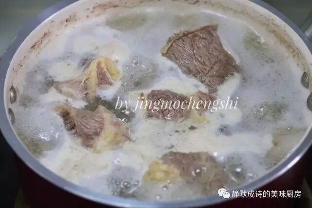 3、再来焯水:牛肉块冷水下锅,煮出浮沫,然后把浮沫用勺子撇干净,直到汤清。然后把牛肉捞出来。