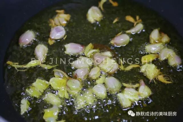 5、热锅凉油,下红葱头小火煸香。我这里用的是毛葱,如果大家买不到它,可以用普通的洋葱代替,但味道肯定是差了一点点的。