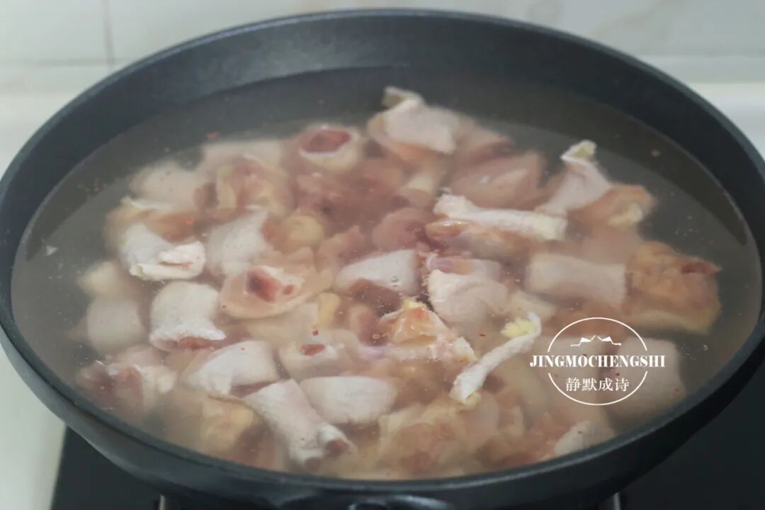1、让卖家帮忙把鸡腿斩成小块儿。我家平时吃鸡肉,或是买鸡胸或是买鸡腿,一个蛋白高一个肉嫩,鸡翅啥的很少买。把鸡块儿洗净,冷水下锅,倒入些黄酒来去腥。鸡肉一定要冷水下锅,才能焯出血沫。