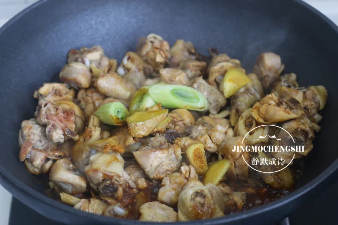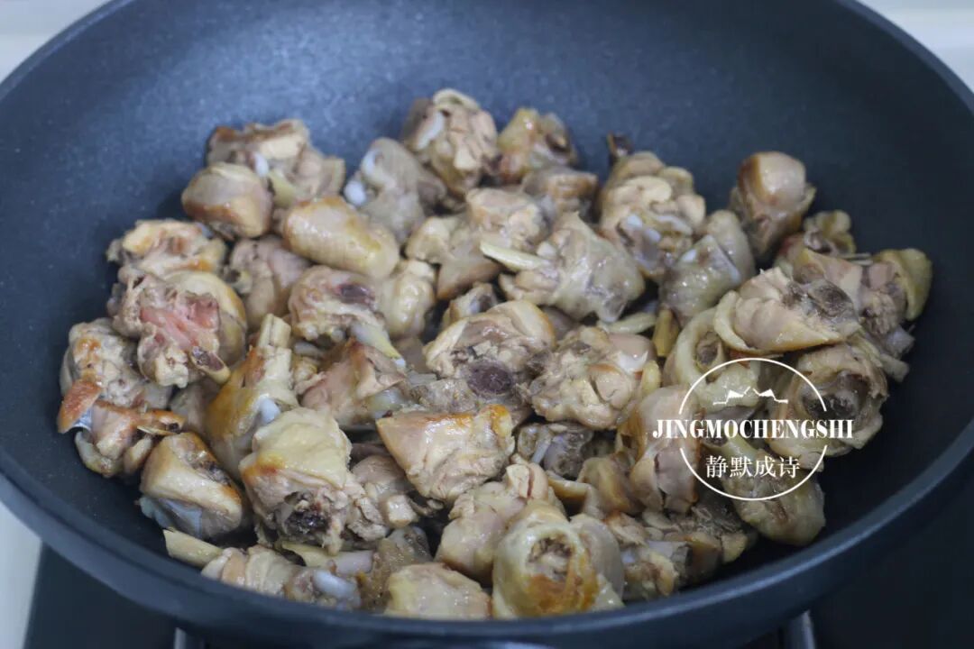 6、热锅热油,油少放一些,把沥过水的鸡肉倒进锅中,小火煸炒,把鸡皮部分煎至金黄。煸炒过的鸡肉会更加坚实,口感会更好一些。