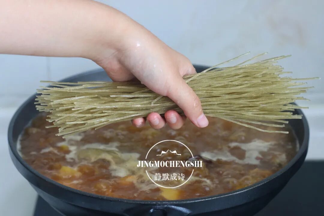 9、把红薯粉条清洗一下也放进去。纯红薯粉条容易烧软,不必提前用水浸泡。