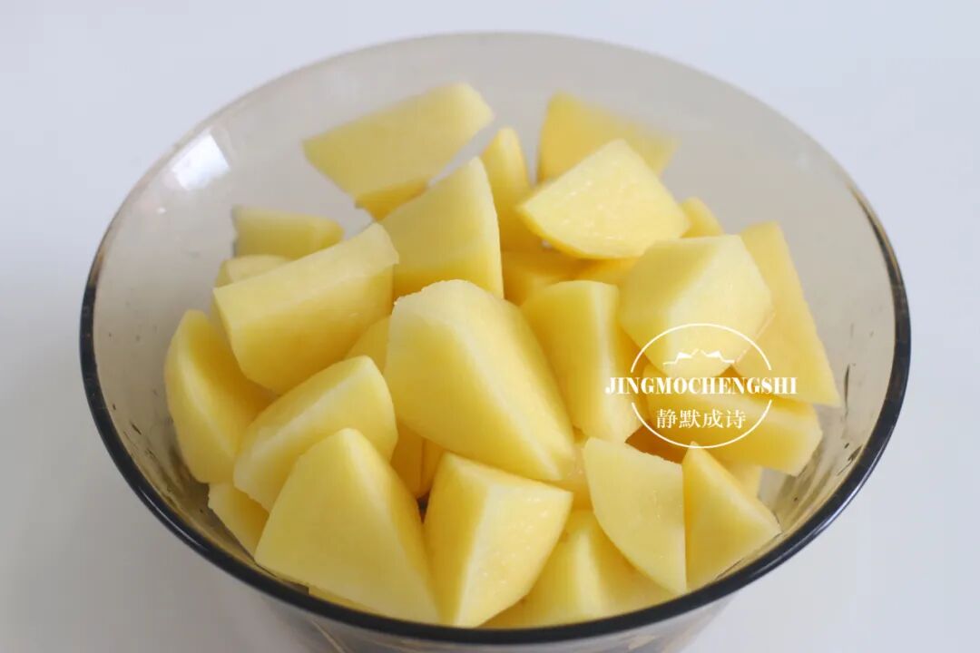 5、土豆去皮切滚刀块儿,洗净表面淀粉后待用。黄心土豆比白心土豆好吃,所以,我用的黄心土豆。