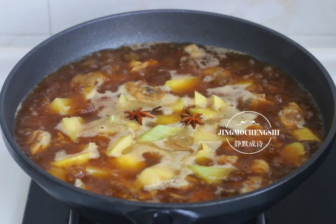 8、添加适量热水,放一小段桂皮,两个八角和一个肉蔻,加入土豆。