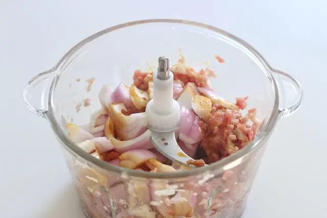 3、9分钟后,把肉拿出来,再用清水冲洗干净,切成小块儿,放进绞肉机,我是把肉绞了几秒钟之后才想起把洋葱一起绞了,分开绞太浪费时间。所以,把洋葱切大块儿也放进绞肉机,食材中的调料也一并都放进去。
