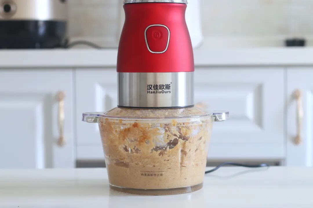 4、启动绞肉机,只需十几秒锅,猪肉和洋葱全部绞成了泥状,特别细腻,猪肉和洋葱你中有我,我中有你,浑然一体,还很入味儿。不得不说,这样做馅儿,效率实在是高,也省去了腌制肉馅儿的步骤。