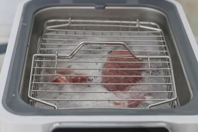 1、把肉放进果蔬清洗机,这个机器不仅可以清洗水果和蔬菜,还能清洗肉类,据说可以去掉蔬果肉类中的激素。