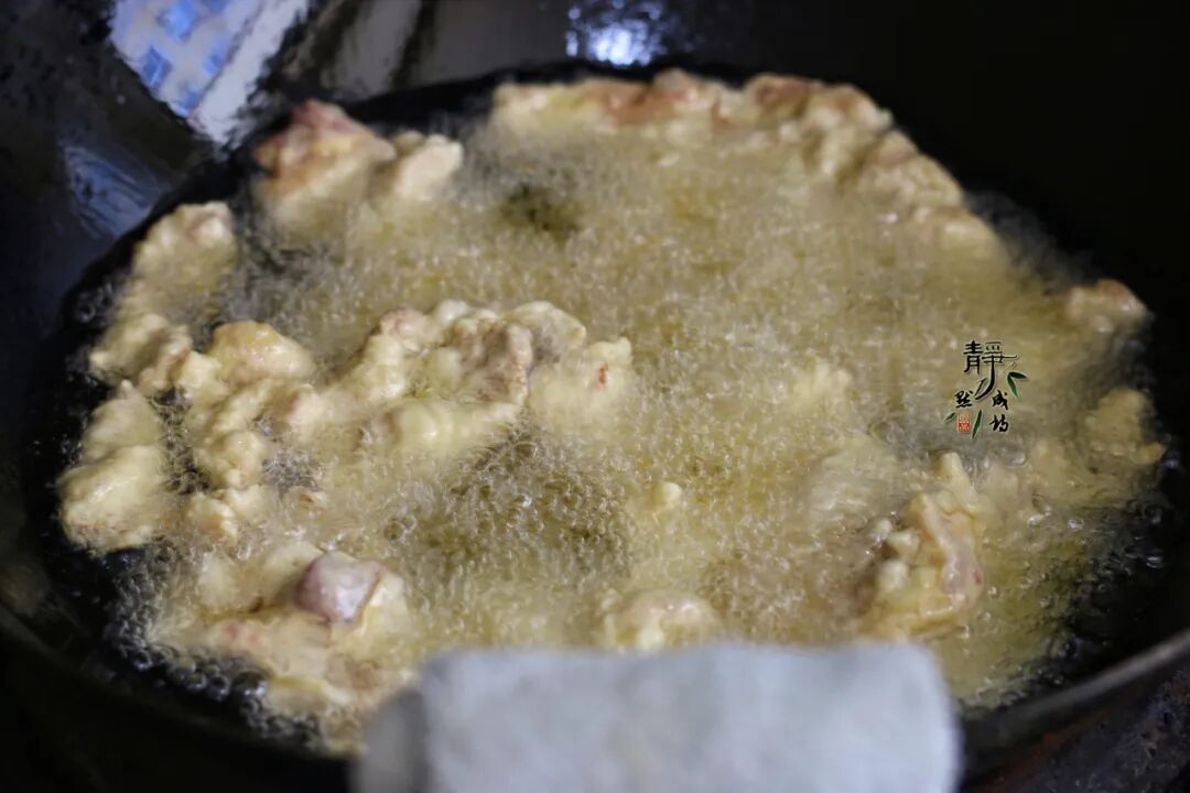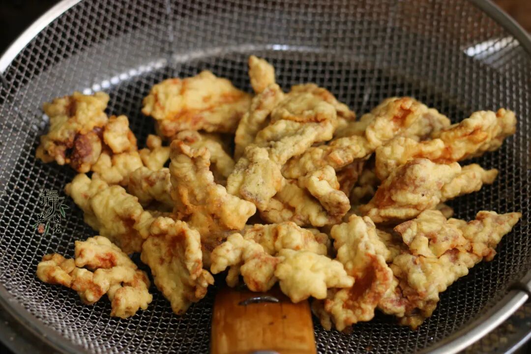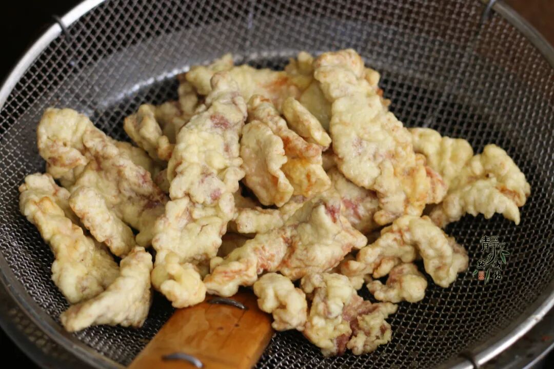 8、接下来还要复炸一次,把油温升高至七成,倒入炸好的肉片,迅速再炸一次,大约半分多钟就可以捞出控油了。经过复炸,里脊肉吃起来会外焦里嫩,口感非常好。