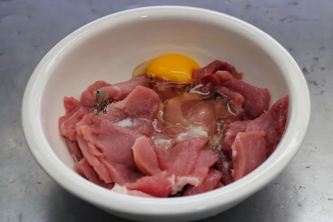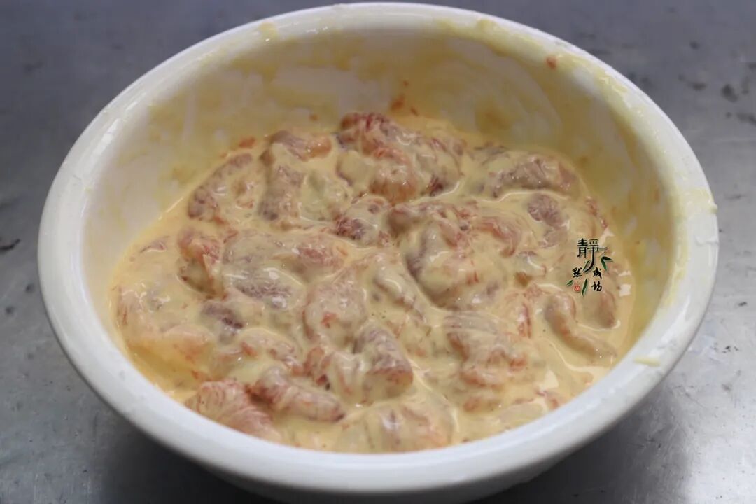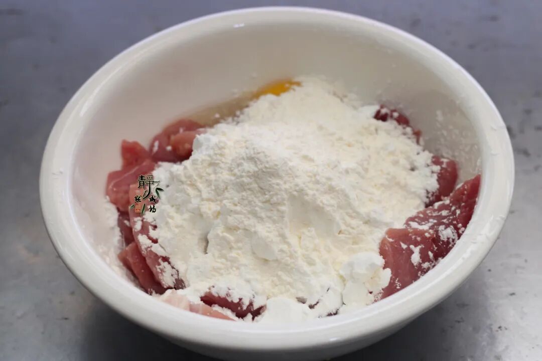 4、下手,把肉片与面糊抓拌均匀,如果面糊发干,就加少许清水。然后静置,腌制几分钟让肉片入底味儿。