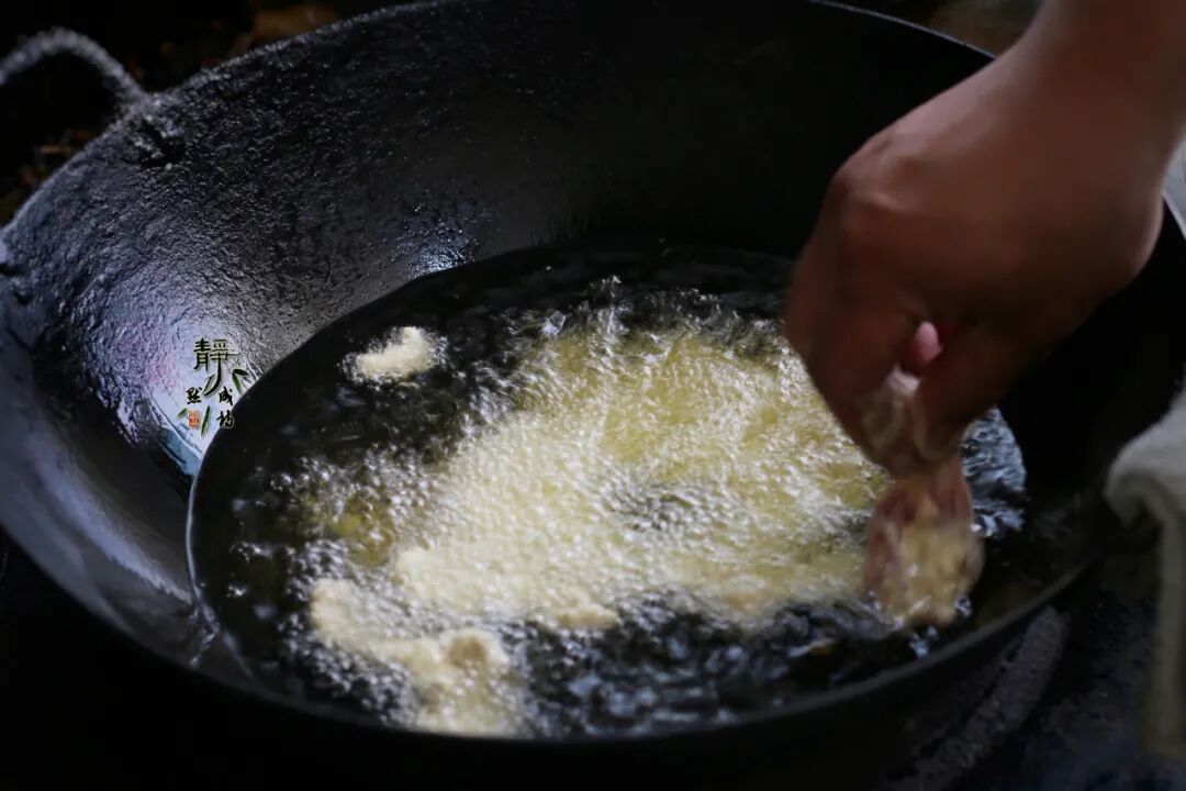 5、宽油加热,油至五成热,继续用手拿起挂好糊的肉片,一片一片地下到锅里,下一片就晃动一下锅,防止肉片粘连。为防止肉片的成熟度不一致,可以关火后操作。