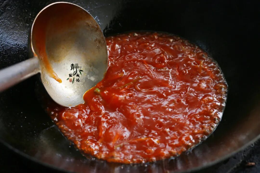 9、接着就可以调制酱汁了。锅中来点儿清水,再加入番茄酱,放入一比一比例的白糖与白醋,再来少许盐,用勺子不停搅拌。