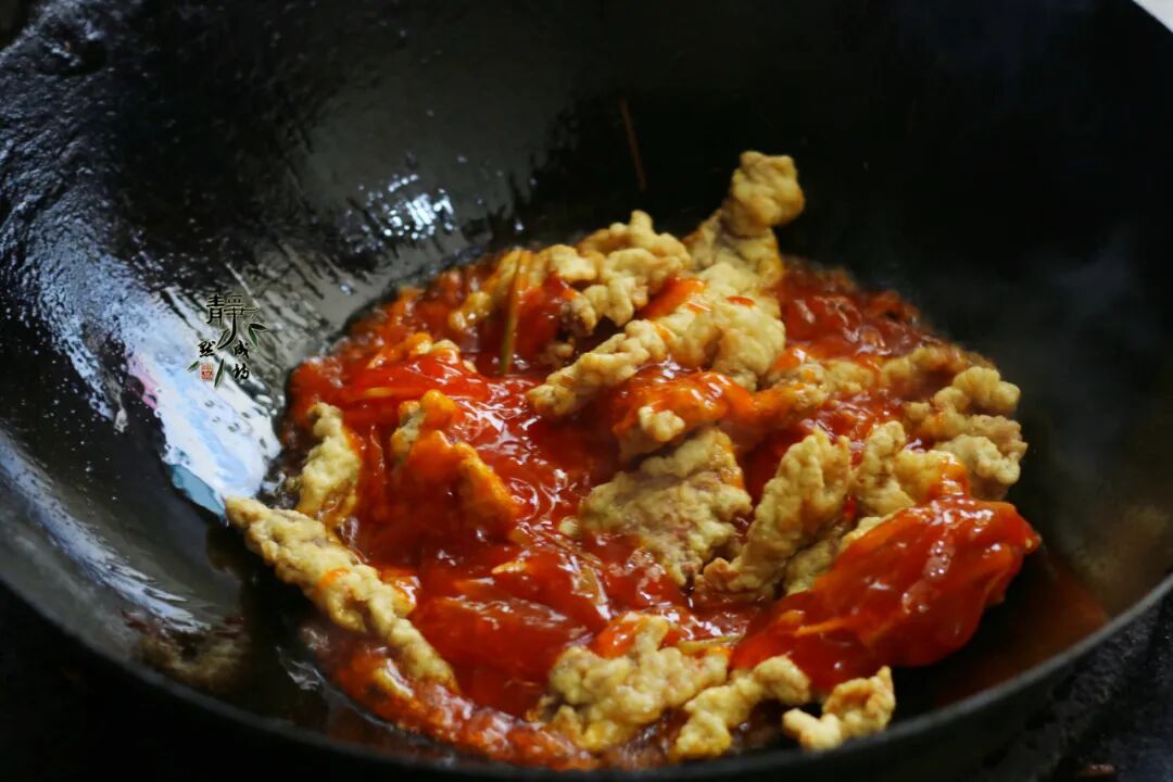 10、待酱汁变得浓稠时,放入姜丝(或姜末)和蒜末,马上倒入炸好的里脊肉,翻炒均匀即可出锅。