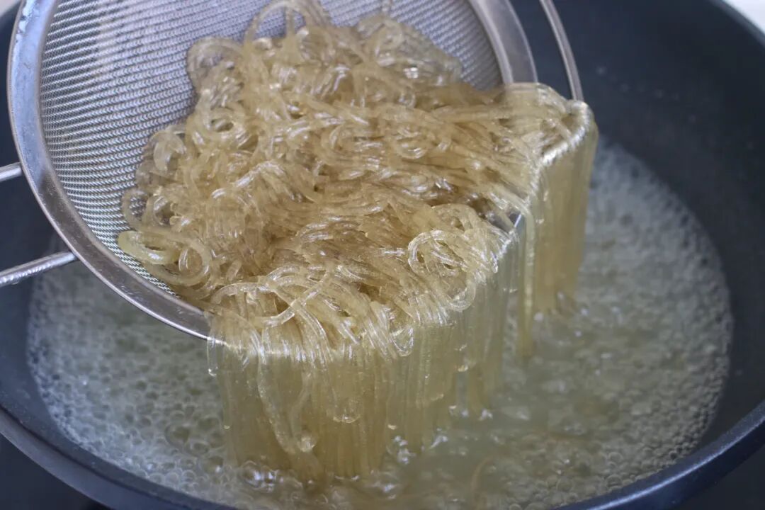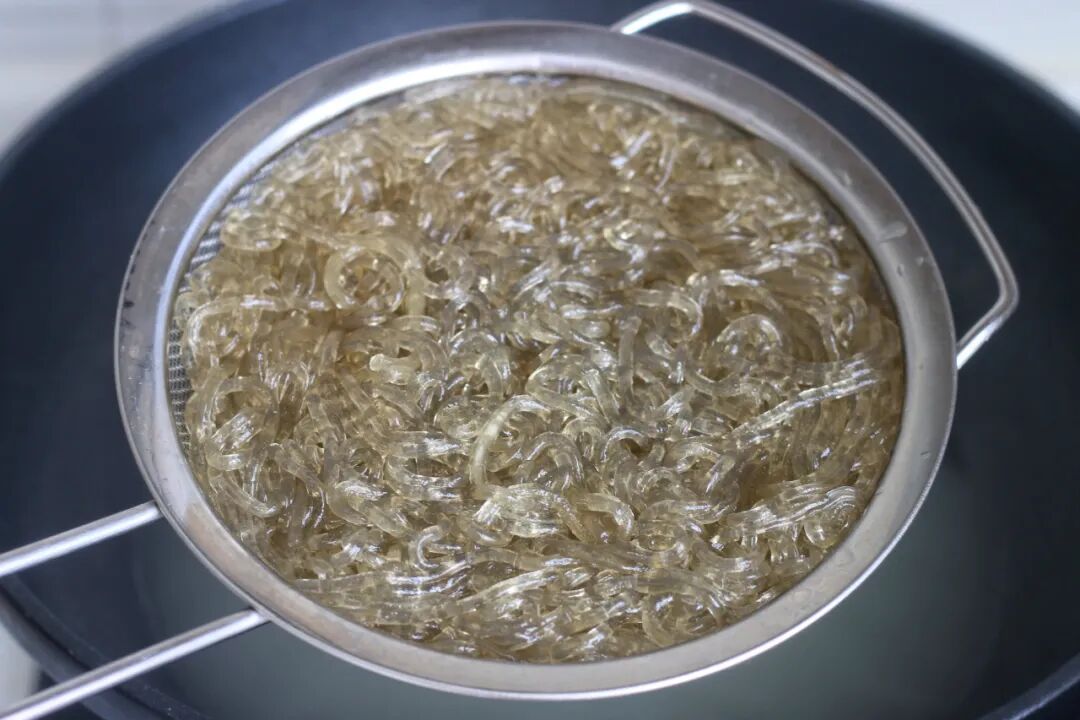 7、过一遍冷水,把粉条表面的淀粉洗掉,然后沥水。这是肉末炒粉条,粉条不沾的关键之一。