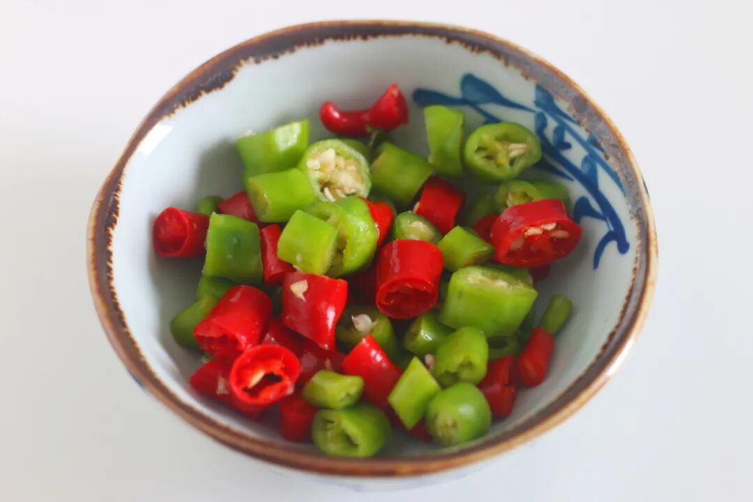 1、先准备好食材。青红辣椒是我家楼上自己种的,辣味儿适中,做这菜非常合适。喜辣的可以用小米椒,不吃辣的可以省略。