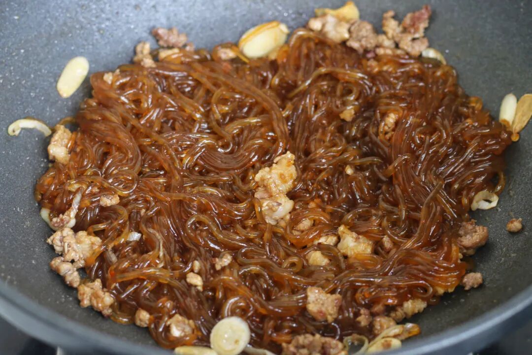 10、然后把粉条倒进去,用筷子快速翻炒几下。