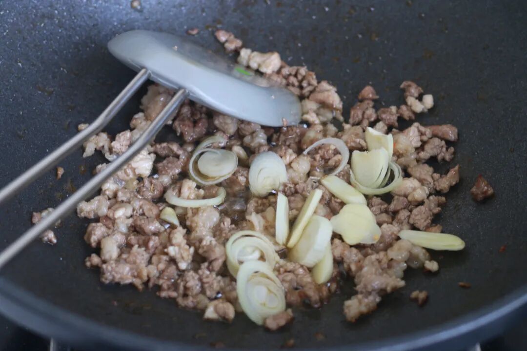 9、接下来就可以进行炒制了。花椒粒冷油下锅,小火炸香后捞出不要,把肉末倒进锅中,小火炒至变色,然后加入蒜片和葱花炒出香味儿。