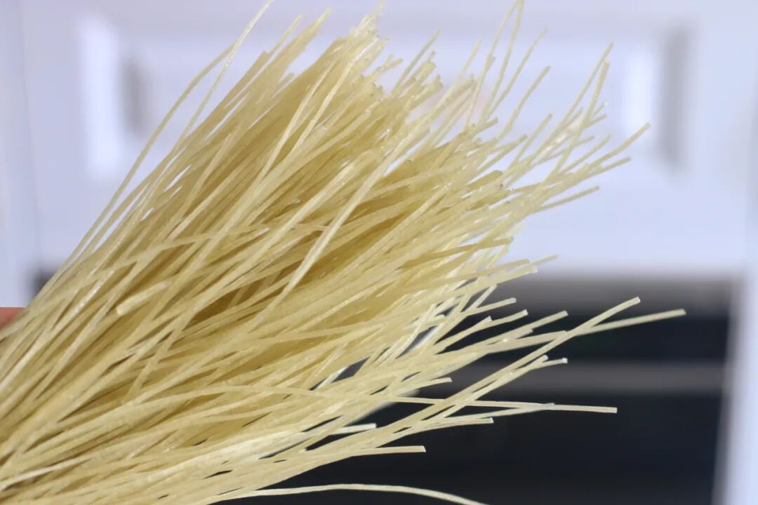 2、红薯粉条剪成长短适中段。纯红薯粉条晾干后,非常容易掰断,而加了明胶的,不仅外观看着透亮,而且不易掰断。