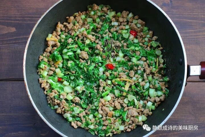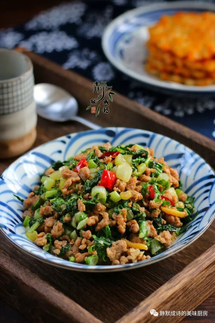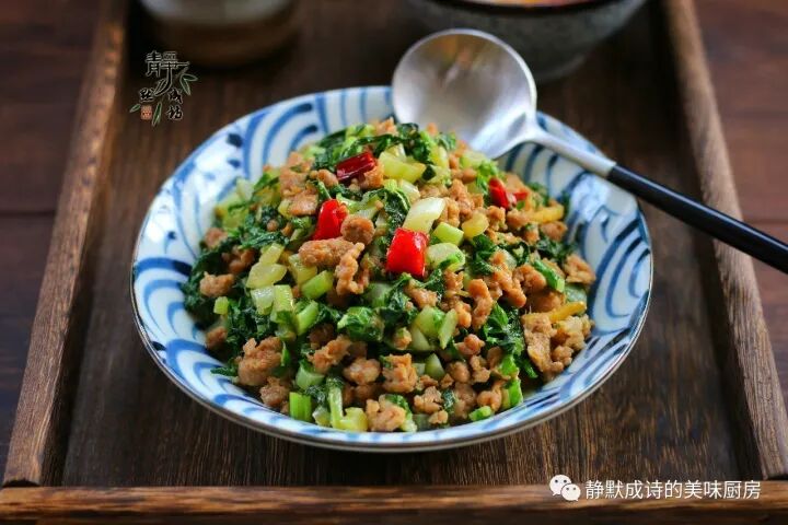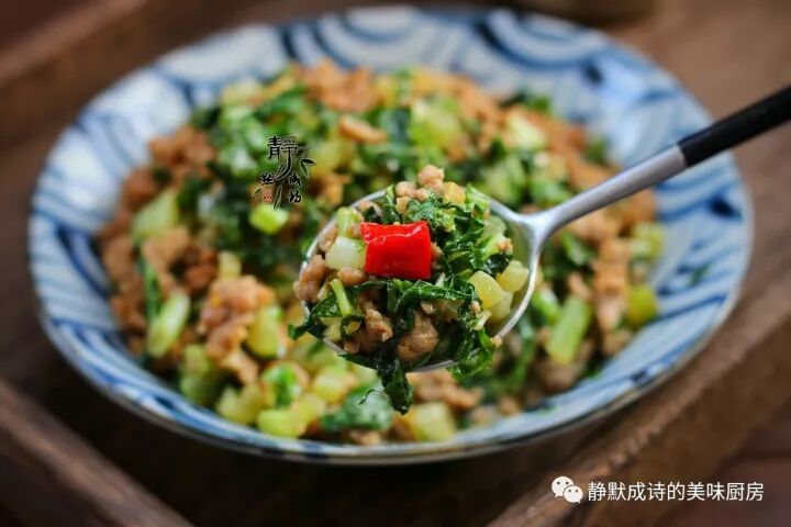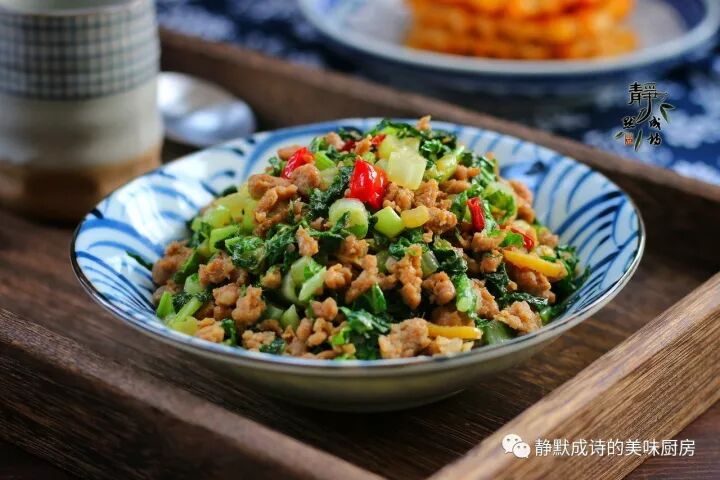 【材料】:萝卜缨、猪肉末、葱姜干辣椒、淀粉、黄酒、酱油、油盐。