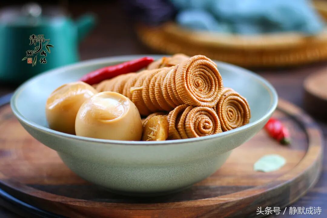 【材料】:豆腐皮4张、鸡蛋5个、干辣椒2个、八角2个、花椒1小把、桂皮1块、香叶3片、姜1块、老抽2汤匙、冰糖适量、盐适量。