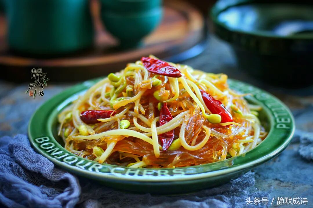 【材料】:黄豆芽500克、粉条(干)适量、葱姜蒜各适量、干辣椒几个、陈醋3汤匙、蒸鱼豉油2汤匙、蚝油2汤匙、油盐适量。